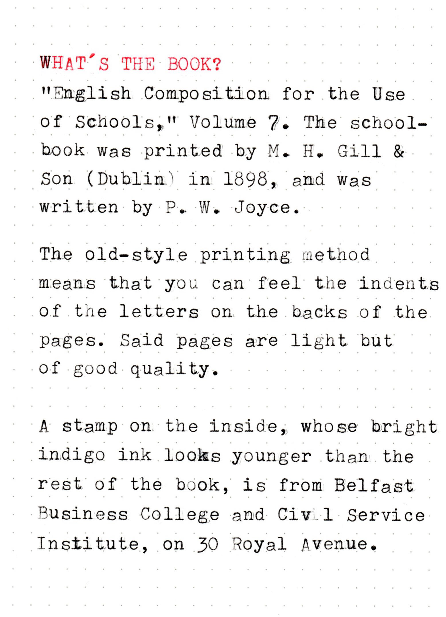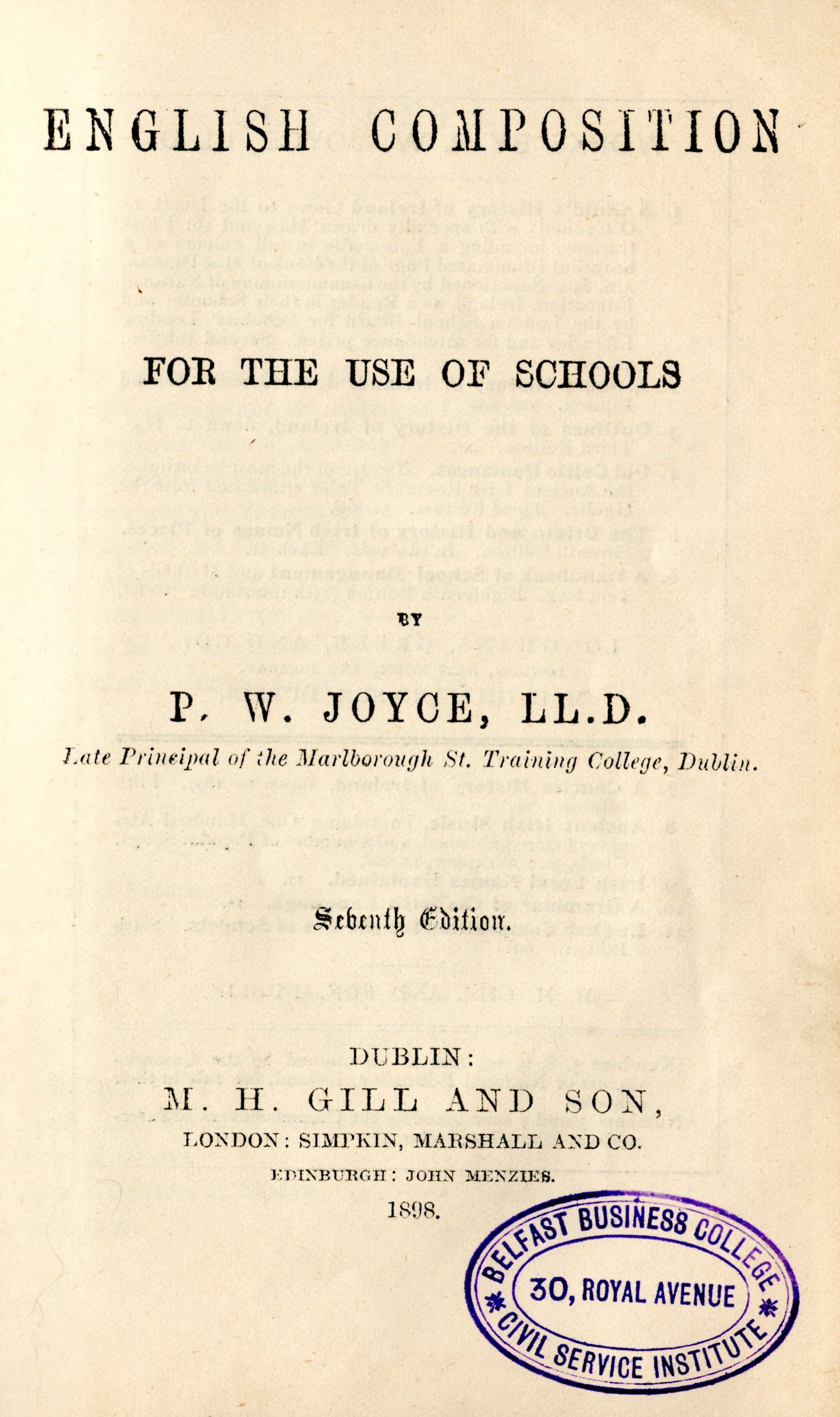 This book belongs to Bessie Maginnis. The book is English Composition for the Use of Schools Volume 7, by P. W. Joyce and printed by M. H. Gill & Son. There's a stamp on the inside from Belfast Business College and Civil Service Institute, 30 Royal Avenue. An address for Bessie is listed as 5 Camden Street, Belfast.