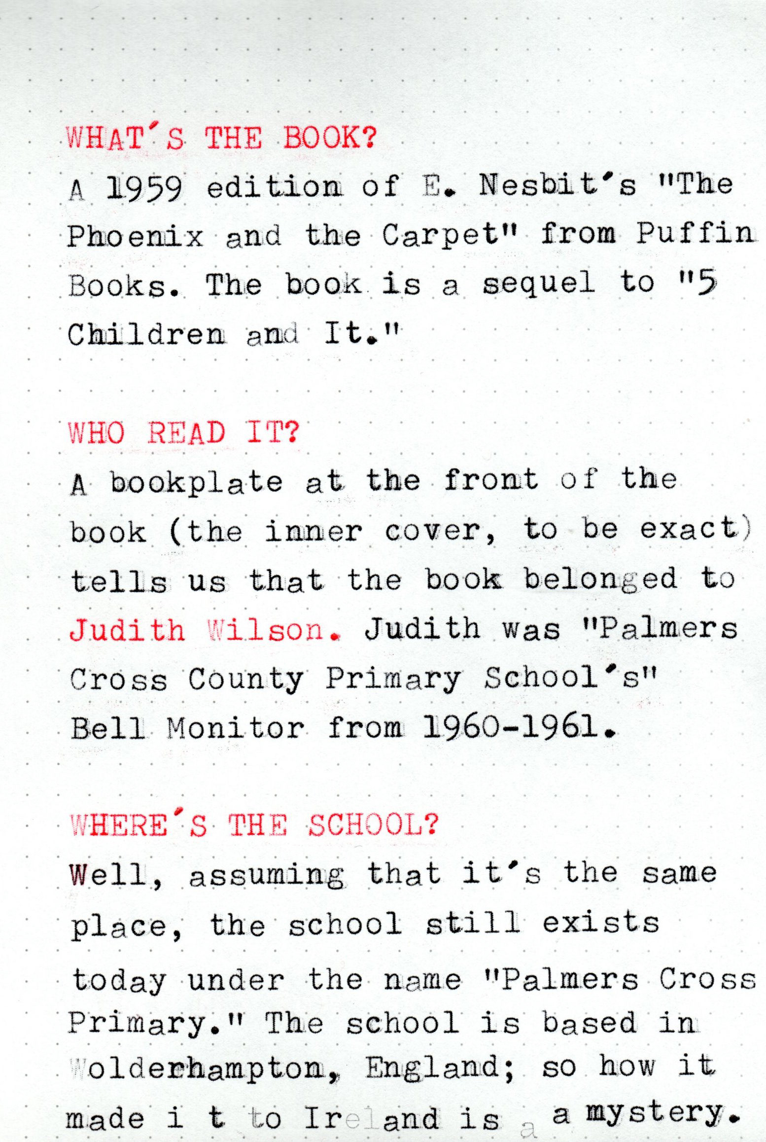 This book belongs to Judith Wilson. The book is The Phoenix and the Carpet, by E. Nesbit. Judith was a Bell Monitor for Palmers Cross County Primary School, 1960-1961.