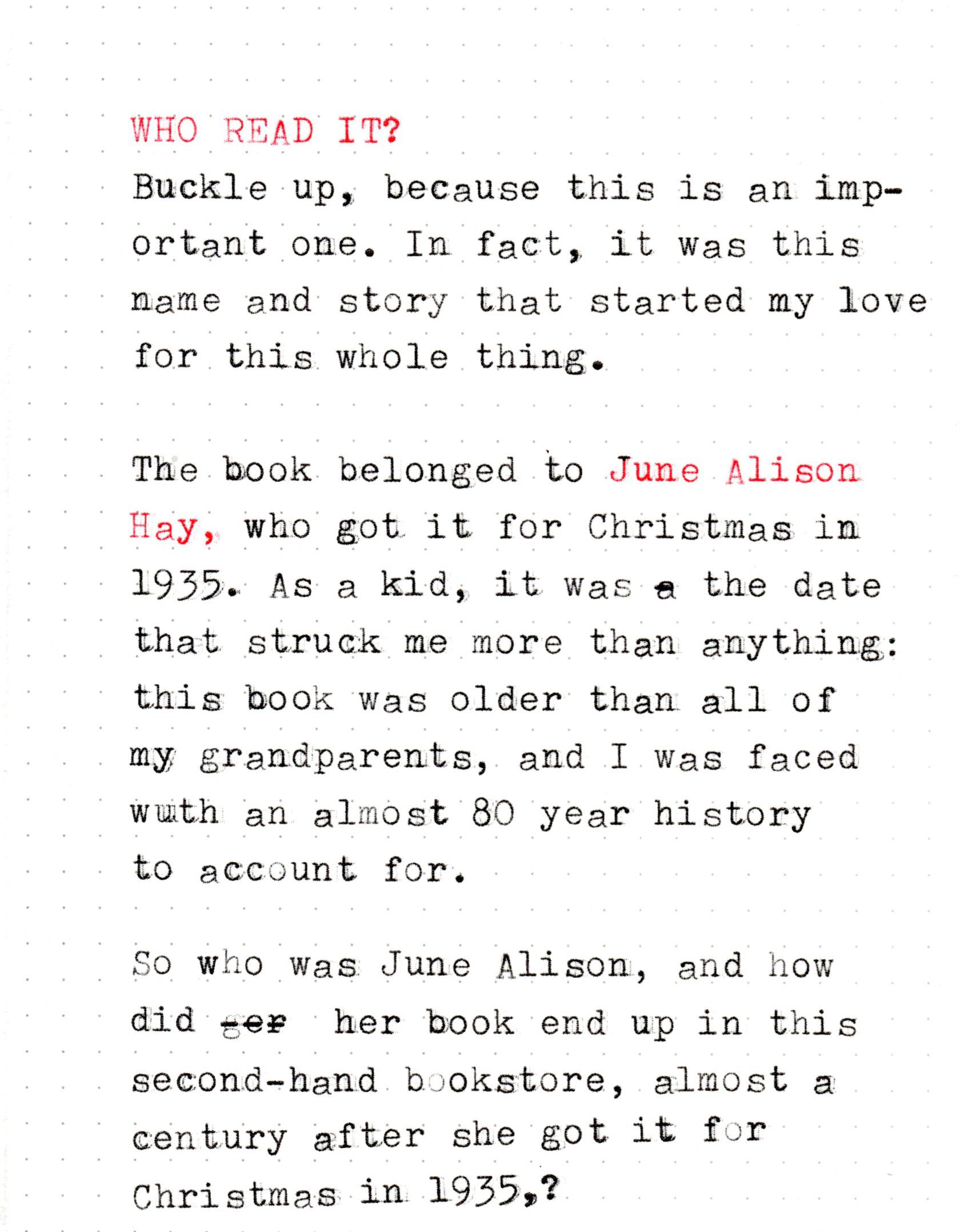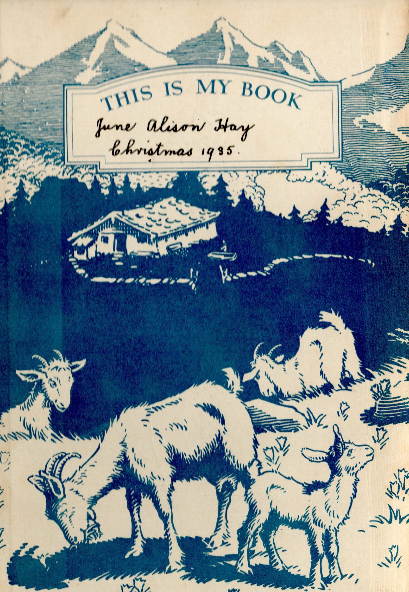 This book belongs to June Alison Hay, from Bangor, Northern Ireland. The book is an edition of Heidi, by Johanna Spyri, illustrated by Maud and Miska Petersham, and published by the Garden City Publishing Company, New York. It was. purchased in Keats & Chapman, Belfast.