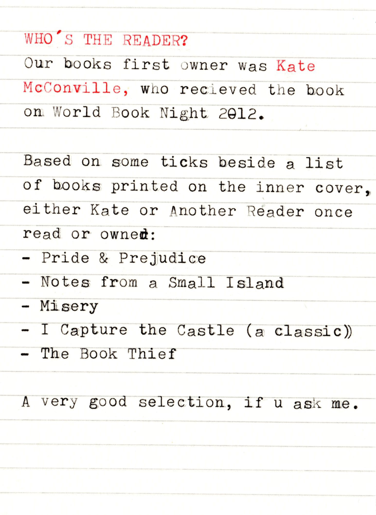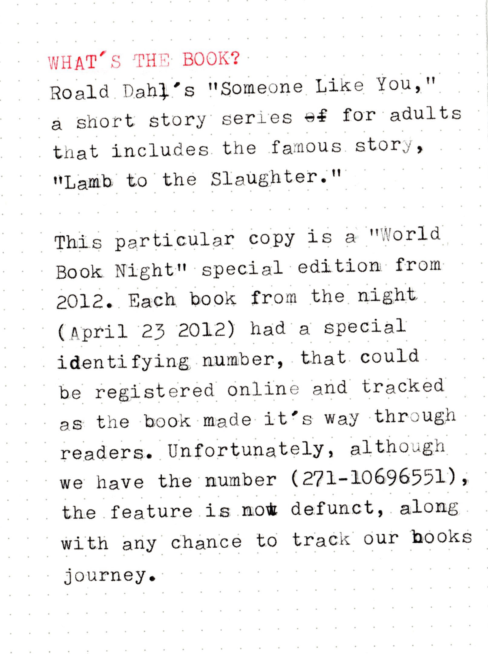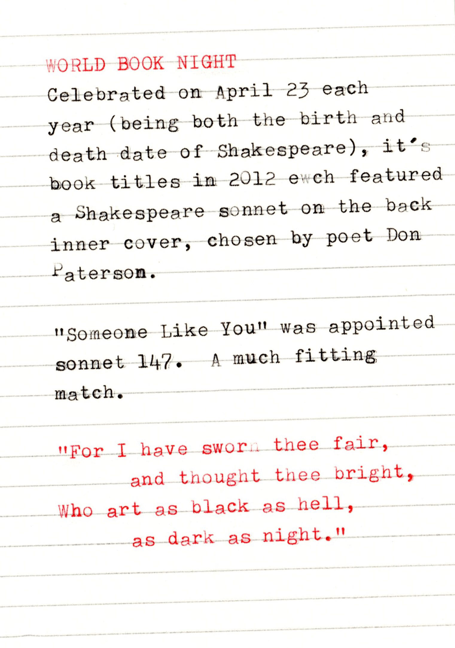 This book belongs to Kate McConville, who gave it on World Book Night 2012. The book is Someone Like You, by Roald Dahl. Shakespeare's Sonnet 147 is in the back.