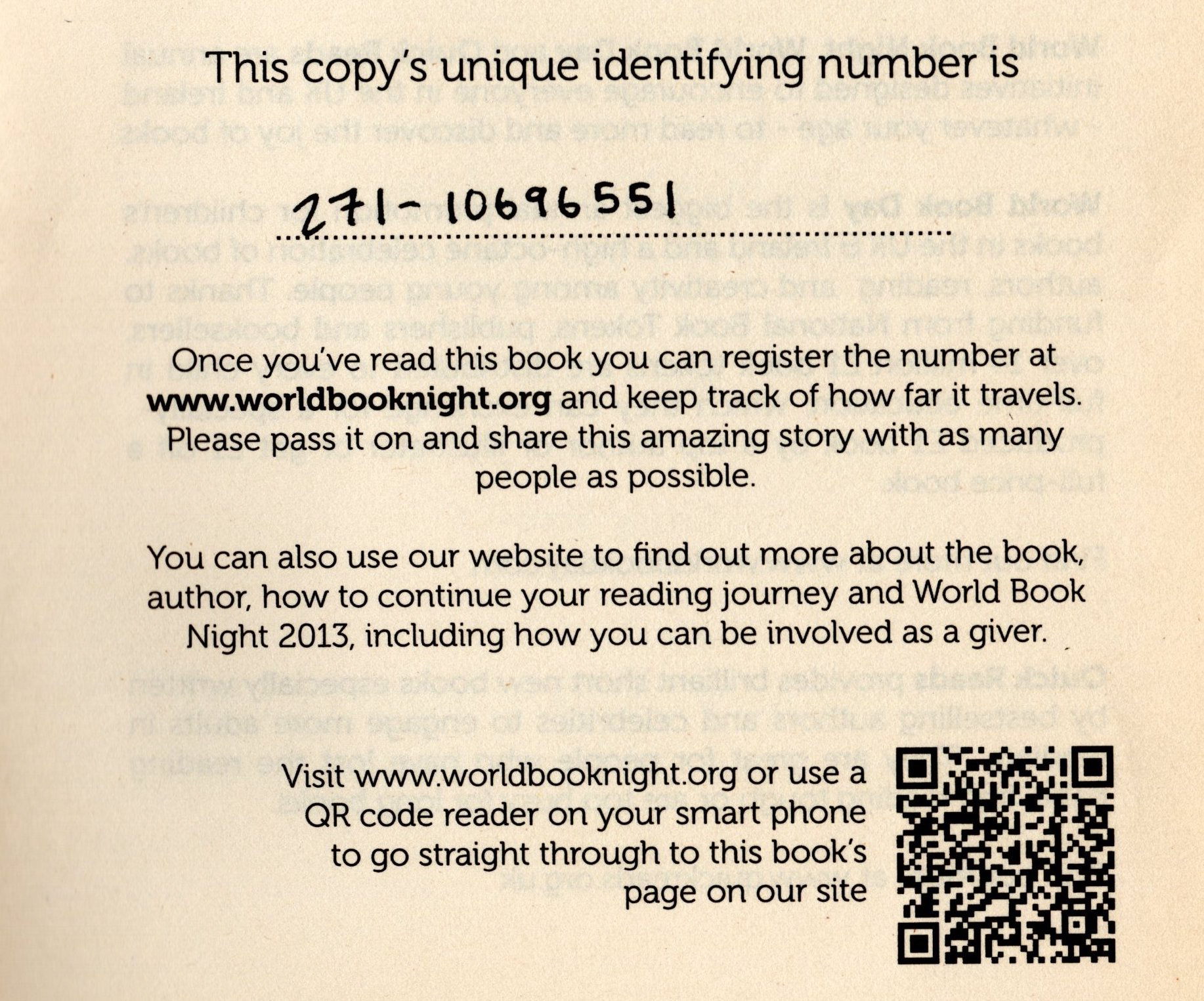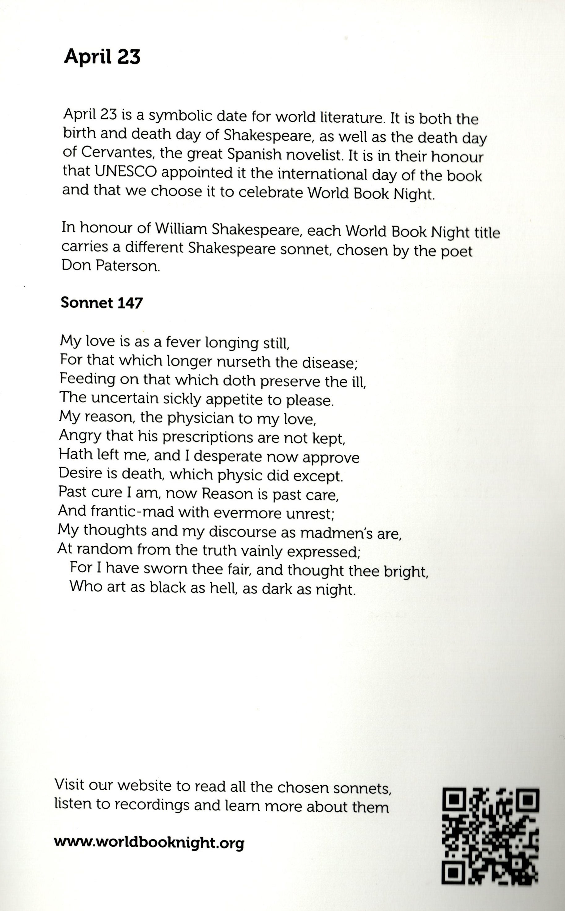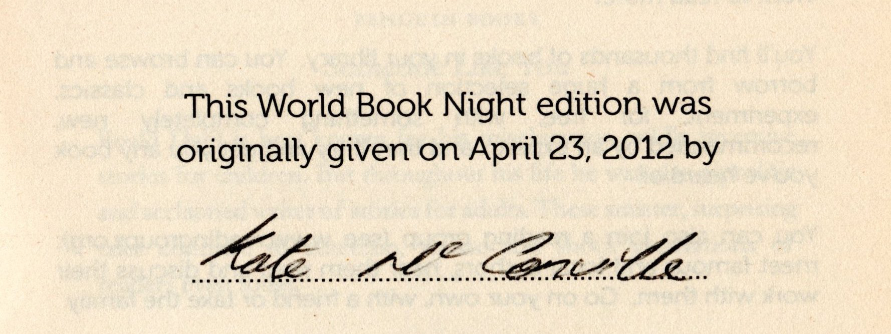 This book belongs to Kate McConville, who gave it on World Book Night 2012. The book is Someone Like You, by Roald Dahl. Shakespeare's Sonnet 147 is in the back.